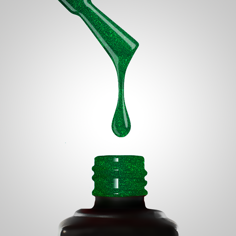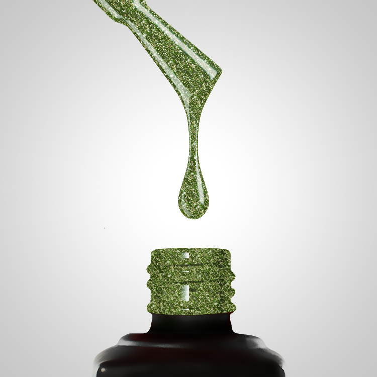 Хибридният лак 336 Grinchy е един от трите нюанса с брокат от колекцията Green Treasures...