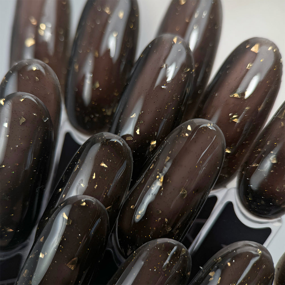 506 Gold Flakes Fishnet from the Wild Vintage collection by Slowianka Nail Trends is our unique offer that you will not find anywhere else. A unique hybrid polish that gives a "pantyhose" effect! It has a translucent black color with a sprinkle of gold particles and metal flakes - also in a golden shade. A perfect choice for those who love gold!