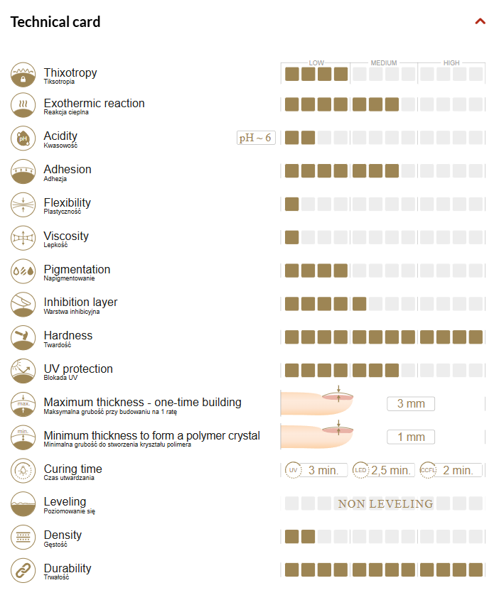New generation gels with an advanced, improved formula without leveling ! Guarantee fast and comfortable work in the salon, ideal for both building artificial nails and strengthening the natural plate. Innovative products that should be in every stylist's kit. The collection impresses with the naturalness of the colors, created on the basis of bestsellers among building gels. It is very light and soft when applied, does not drag and does not form "mountains of pills" during building. Its thin consistency allows you to work very quickly, without worrying about flooding the cuticles. It is ideal for Dual Forms, as it does not flow into the center of the form, as well as for stenciling, skeletonization and the entire building of nails in one layer. It is also great for extending the covering egg during French building and for strengthening the tip of the natural nail, especially for very thin nails, when combined with Tixo gels. It is also ideal for beginner stylists, as it does not require additional training or extensive practice - it is easy and fun to work with.