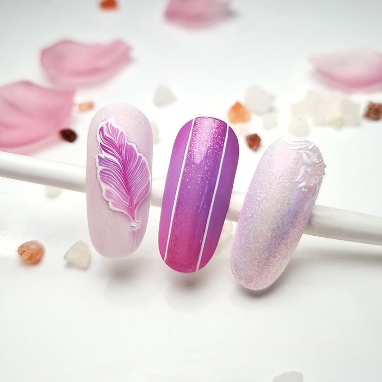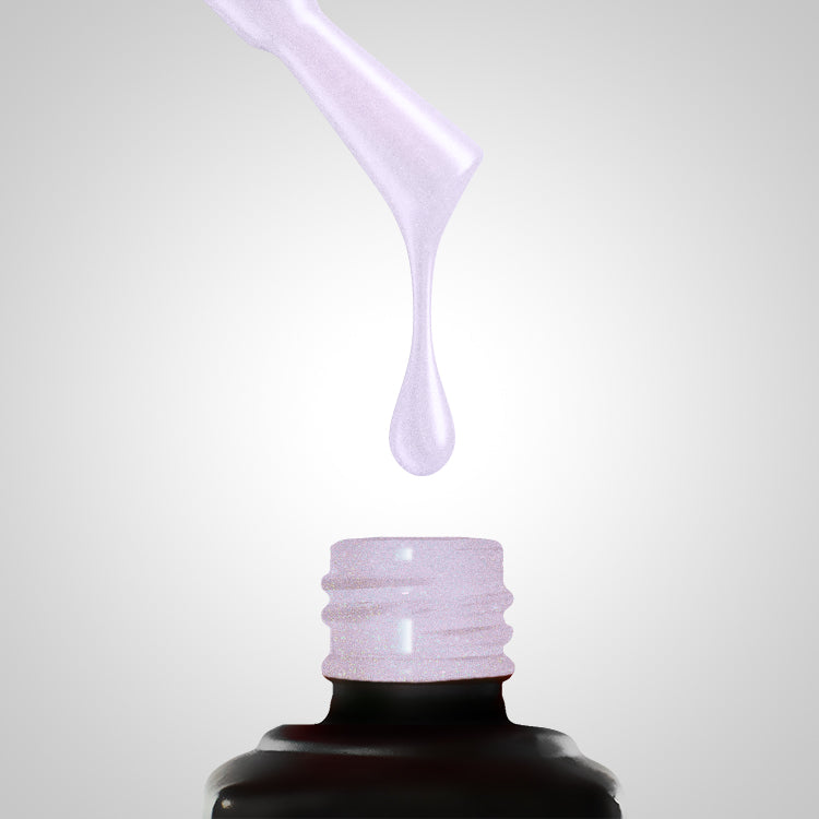 Гел лак № 63 в нюанси на виолетово, лавандулово и холографско сребристо, със зелени и виолетови подтонове. Необходим ви е само един продукт, за да направите изключителна декорация.