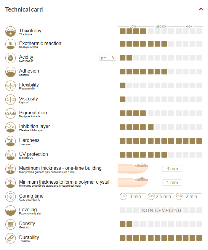 Освен това, нашите гелове могат да се използват за удължаване на ноктите без пилене, благодарение на подходящия метод на нанасяне. Най-уникалното е, че цветовете в тази серия гелове са абсолютно същите като в серията тиксотропни гелове, което прави възможно перфектното комбиниране на тези продукти, без да се притеснявате за обезцветяване и разлики в цвета. Това е особено полезно при изграждане на нокти с не-нивелиращи гелове и реставрации с тиксотропни гелове, което е много популярно сред стилистите.