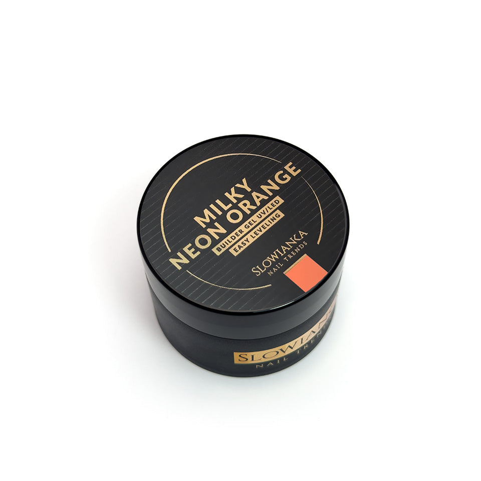 Milky Neon Gel Orange е твърд, неоново-оранжев изграждащ гел, използван за изграждане на нокти и създаване на маникюр в стил Бейби Бумър. Той е със средна плътност, кремообразен, не се разтяга, задържа структурата дълго време. Нивелира добре и не заливат кожичките, дори през лятото.